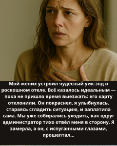? Одна женщина рассказала, как её жених организовал романтические выходные в роскошном отеле. Всё шло идеально, пока во время выезда его карту не отклонили. Она заплатила сама, но администратор отвёл её в сторону и шёпотом признался: это не первый раз — мужчина приезжает всегда с разными женщинами, а платить в итоге приходится им…